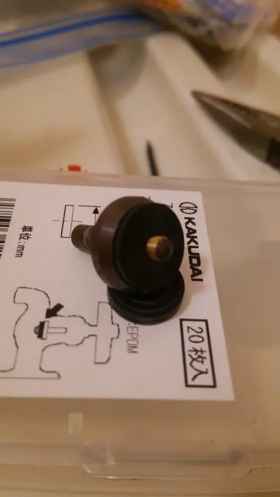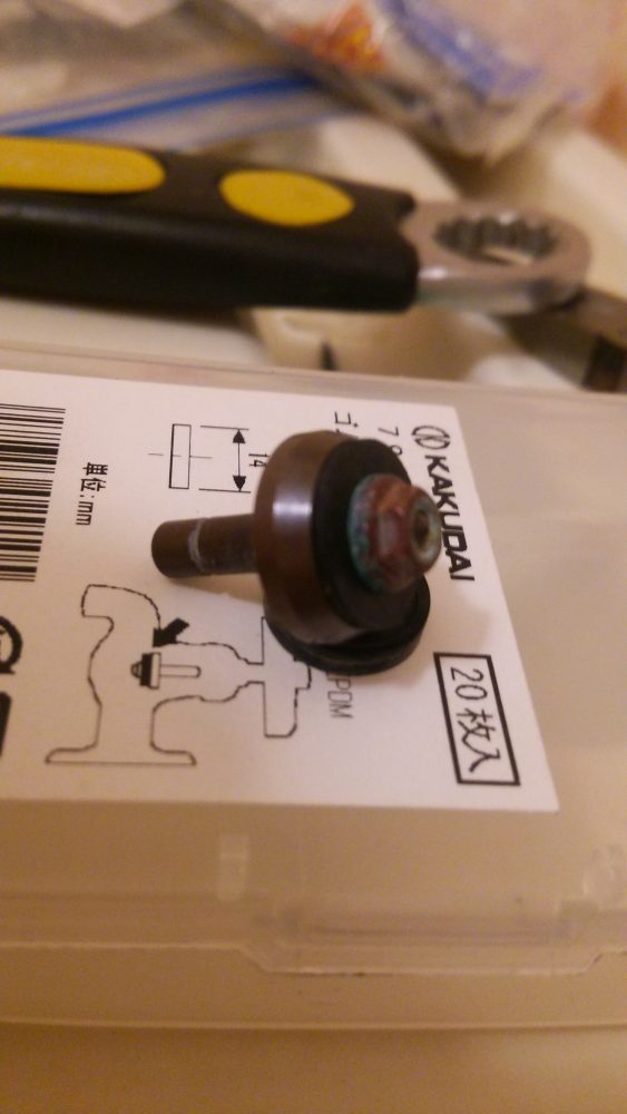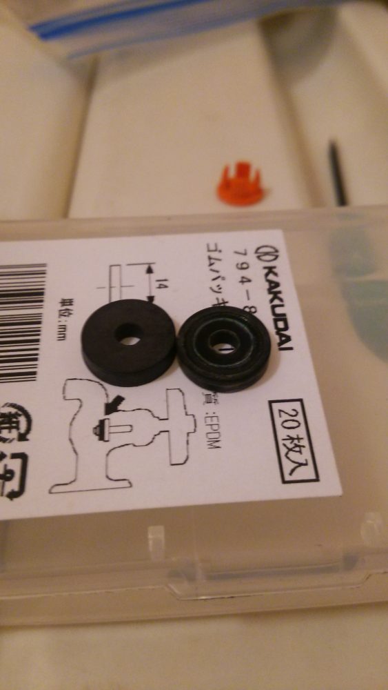 ここでゴムパッキンの登場です水栓自体は toto製ですがゴムパッキンのサイズは jis規格で定められているものがあるらしく、各社共通なので今回はカクダイのものを使用しています。